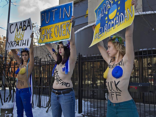 Активистки движения FEMEN в среду провели акцию в поддержку киевского "евромайдана" у посольства Украины в канадском Квебеке. Три девушки с плакатами "Слава Украине", "Putin game over", "Glory Euromaidan" и раскрашенными в национальные цвета Украины грудями требовали подписать соглашение об ассоциации с ЕС.