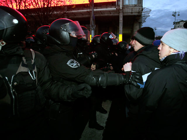 На Майдане Незалежности в Киеве, где который день продолжаются митинги за сорвавшуюся евроинтеграцию Украины, появились бойцы спецподразделения "Беркут" в полном снаряжении. Они начали оттеснять демонстрантов с участка Майдана Незалежности напротив Дома профсоюзов, сообщает NEWSru.ua. Ранее власти заявляли, что разгон митинга не планируется.