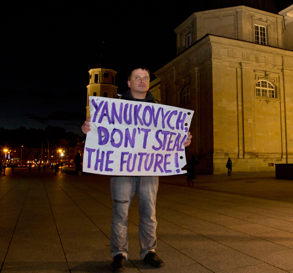 «Янукович, не кради наше будущее» — требует житель Вильнюса, солидарный с «евромайданом». 29 ноября 2013 г.