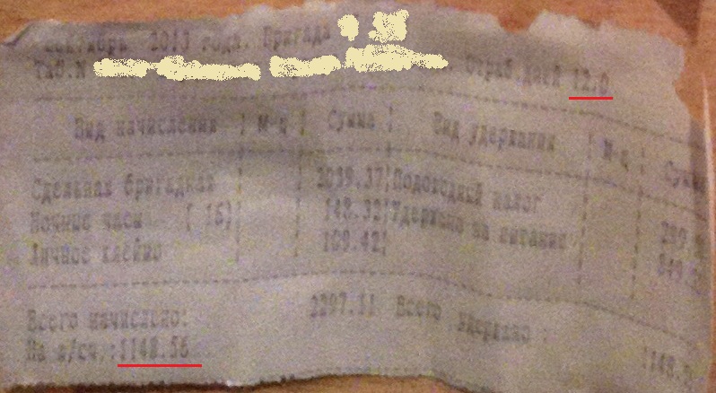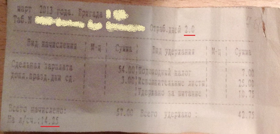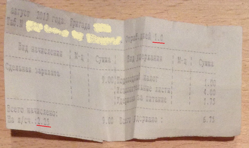 Подтверждением заработка и стажа осужденных является расчетный листок. Листки выдаются каждой работнице на руки. Поначалу все крайне удивлялись тому, что работали по 6 дней в неделю, а в листках отработанных дней числится всего 5 или 6 за месяц. Задавали вопросы администрации. Но здесь, если задавать много вопросов, — ответом служат рапорта и взыскания. Подвергаться унижениям на дисциплинарных комиссиях, а после сидеть в штрафном изоляторе — каменном мешке-одиночке без теплых вещей, чая и сигарет, мало кто хочет, а потому вопросы отпадают.