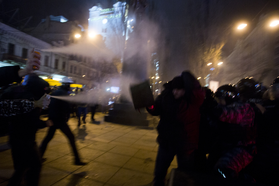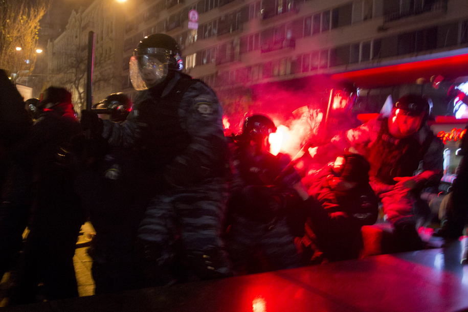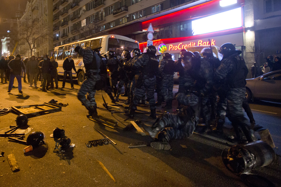 "Беркутовцев" загнали в угол площадки и практически обливали перцовым газом из баллончиков. После этого в них кинули несколько фаеров, фанаты начали драться с первым рядом милиционеров, и давить на их строй: задние ряды оказались загнаны в угол и начали сваливаться на проезжую часть бульвара. Они начали организованно отходить в свой автобус, но отставших толпа догоняла, бросала на землю и била. Впрочем, после нескольких ударов активисты успокаивались и давали "беркутовцам" убежать.