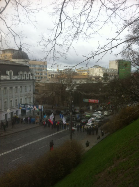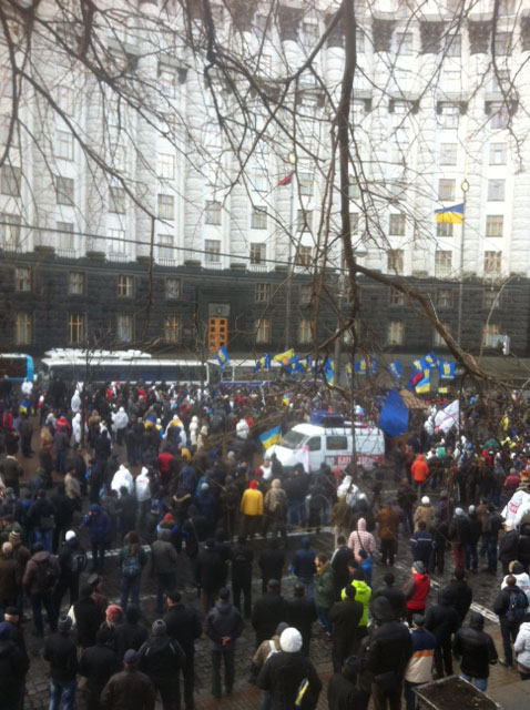 Дом правительства Украины с утра окружен демонстрантами. По обеим сторонам улицы Грушевского проезд блокирован частными автомобилями, прямо перед входом в здание собралось около 2000 человек. Выступающие требуют отставки правительства Николая Азарова и президента Януковича.