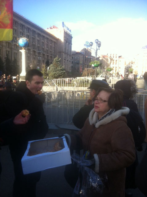 Жители спальных районов Киева начали с обеда привозить на Майдан пластиковые контейнеры с теплой едой, термосы с чаем, печенье и круассаны. Некоторые бабушки стали даже провозить на маршрутках и в вагонах метро большие трехлитровые банки с соленьями и вареньем.