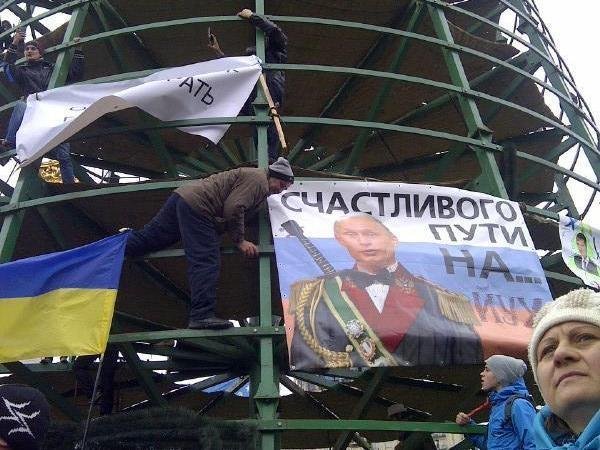 1 декабря сторонники евроинтеграции на Майдане с криками «Елку - геть!» начали демонтировать главную елку страны. Митингующие снесли заградительные металлические щиты, которыми было обнесено место сооружения новогодней елки. После этого милиционеры и коммунальщики разбежалась. В итоге, протестующие взобрались на недостроенную конструкцию новогодней елки и установили там национальные, европейские и партийные флаги, сообщает «Обозреватель».