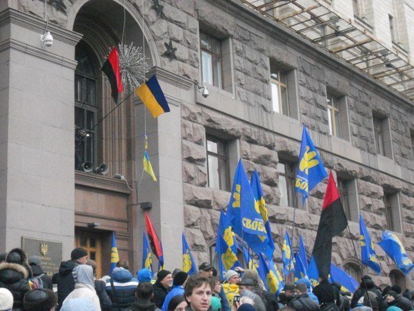 Киевская городская администрация после штурма. Помимо флагов «Свободы» в толпе и на фасаде черно-красные флаги УПА