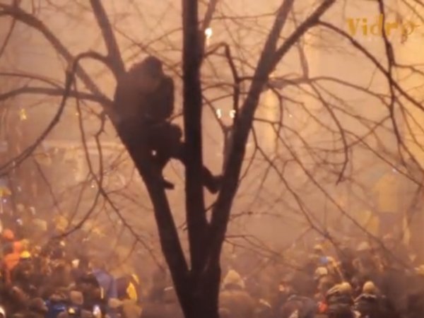 Скриншот из ролика Vidro В ночь на субботу "Беркут" разнес киевский Майдан, в воскресенье начались новые протесты - еще более массовые. Частично они имели последствием захват нескольких государственных зданий и попытку - скорее декоративную - ворваться в Администрацию президента. На фотографии в заголовке как раз этот эпизод: милиция окутывает граждан слезоточивым газом. В.Януковича в здании, конечно, не было. Но политические-то последствия придут к нему не через эти двери.