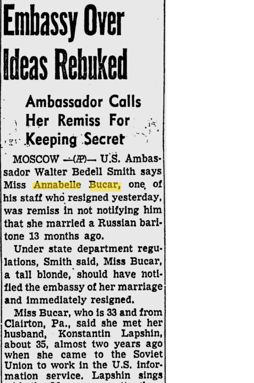 Продолжение серии, начало читайте здесь.28 февраля 1948 года американская пресса возвестила сенсацию: накануне сотрудник посольства США в Москве 33-летняя Аннабел Бюкар подала прошение об отставке. В своем заявлении на имя посла Уолтера Беддел-Смита она написала, что служба в посольстве несовместима с ее нынешними взглядами, и сообщала, что намерена остаться на постоянное жительство в Советском Союзе.