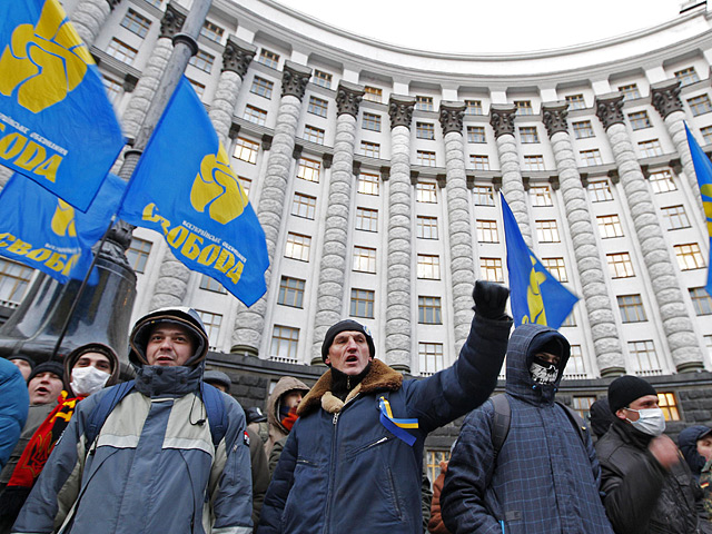 Сторонники партии "Свобода" пикетируют здание Кабинета министров Украины, где проходит очередное заседание правительства. Как передает "Интерфакс", участники пикета выстроились вдоль забора здания Кабмина, перегородив проход в здание. Они держат большой баннер "Украина - это Европа", а также скандируют "Азарова в отставку!", "Захарченко в отставку" (министр внутренних дел Украины Виталий Захарченко. - прим. ред.) и традиционные для нынешних протестов лозунги типа "Слава Украине - героям слава". У входа в Кабмин установлено металлическое ограждение, за ним плотной цепью стоят милиционеры, передает ИТАР-ТАСС.