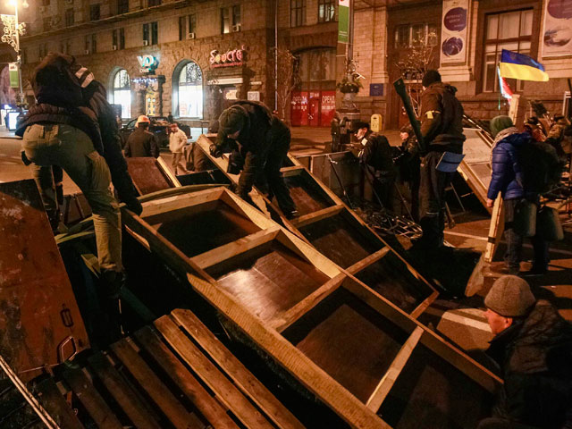 Демонстранты воспользовались металлическими щитами и конструкциями разобранной новогодней елки, чтобы выстроить баррикады. К примеру, на пересечении Крещатика с улицей Городецкого образовались горы дров и мусор, а сама площадь забаррикадирована щитами и огромными деревянными ящиками. Пока на майдане обстановка спокойная.
