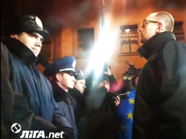 Затем он задал вопрос (см. картинку в заголовке).: "Янукович есть, не знаете? Я в гости к нему хотел пойти". Милиция не отвечала и Яценюк добавил: "Не знаете... Думаю, что наверняка нет... Ну что же, ну будем как-то так тогда жить, пока он указ не подпишет". Так было выполнено первое обещание Яценюка.