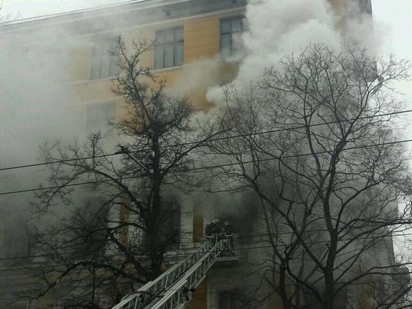 Пожар произошел на третьем этаже в здании по улице Миусской, дом 3. Пожару присвоили второй ранг сложности. Пожарные не смогли потушить возгорание с помощью воды из-за присутствия в лаборатории химических веществ.