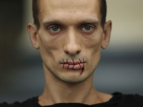 Не больше чем Pussy Riot, там все продумывалось не меньше, но методики другие. Все дело в подходе. У них нет ничего случайного, все продуманно. Даже само изображение, яркие балаклавы на фоне алтарного золота, очень действенно. Там нет случайностей. Нельзя говорить, что кто-то больше внимания обращает, кто-то меньше. Мой подход отличается тем, что я все показываю посредством себя и действий на себе. Можно было увидеть много обвинений меня в садомазохизме и т.д. Меня очень радует, когда так говорят.… Потому что люди видят себя, а проявление безразличия к тому, что с тобой делает власть – это и есть настоящий садомазохизм.