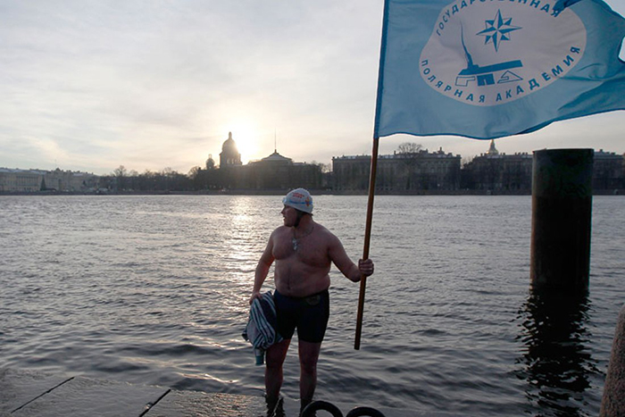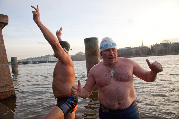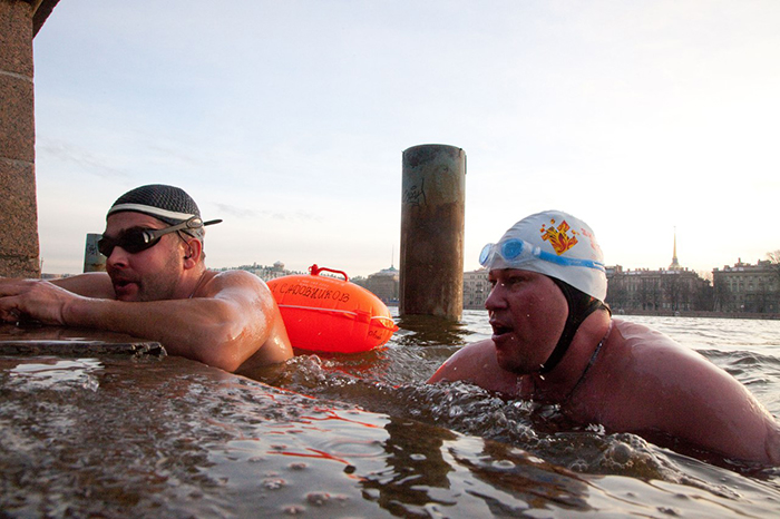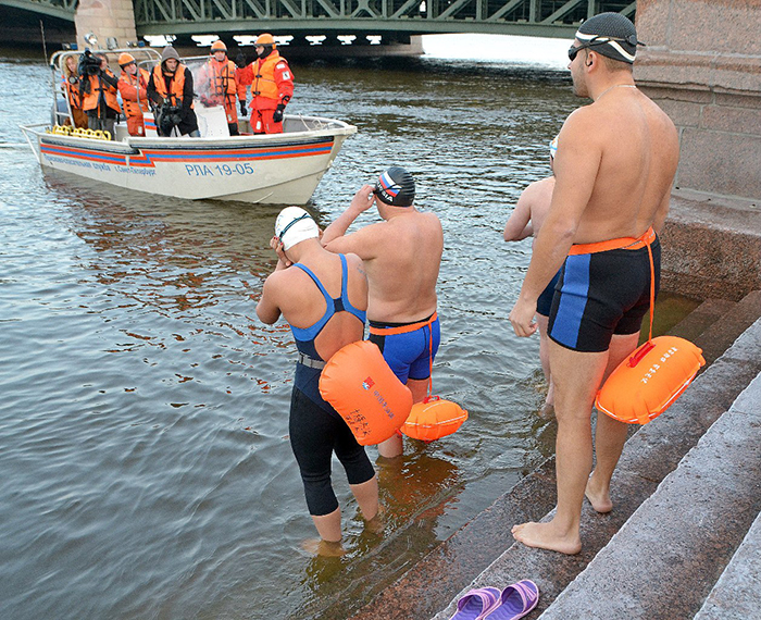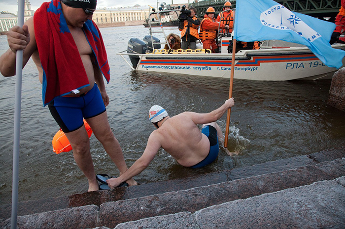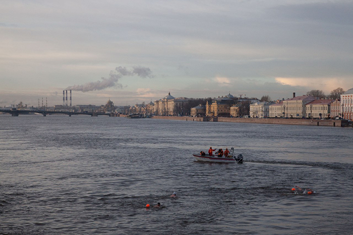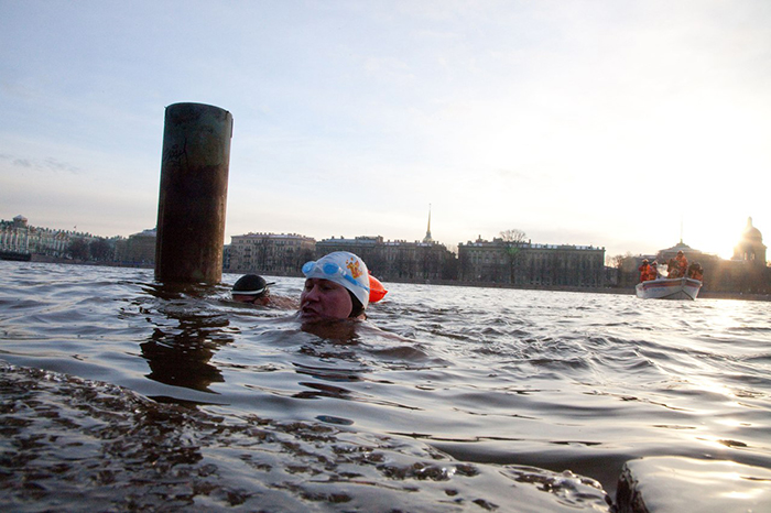 В Петербурге вчера прошел заплыв через Неву: четверо жителей Хабаровска, Новосибирска и Благовещенска преодолели расстояние в 600 метров от одного берега реки до другого. На фото дня: как морозостойкие пловцы ныряют в воду, температура которой 0 градусов, а группа спасателей присматривает за ними с лодки.