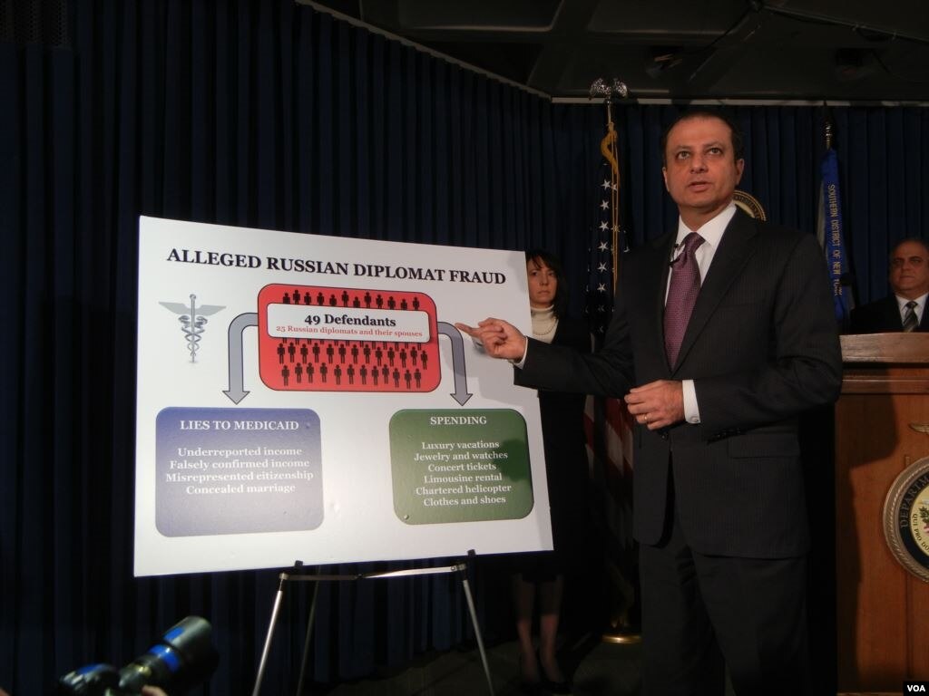 Об обвинениях в адрес россиян объявил на специальной пресс-конференции прокурор Прит Бхарара. По его словам, из 49 граждан России, которым предъявлены обвинения, 25 – бывшие или действующие дипломаты, сотрудники российской миссии при ООН, генконсульства и торгпредства, остальные – их супруги. На протяжении девяти лет, с 2004 по 2013 год они систематически обманывали американское государство, получив в итоге медицинскую помощь и талоны на питание для себя и своих детей на сумму около 1,5 миллиона долларов. Законного права на это они не имели и фактически похитили деньги у малоимущих нью-йоркских семей. Бхарара уточнил, что из 49 обвиняемых лишь 11 по-прежнему находятся в Соединенных Штатах.