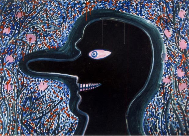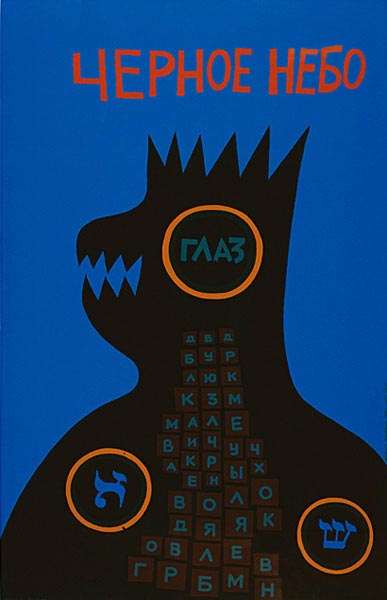 © Михаил Гробман Михаил Гробман. Черное небо. 1981. Гуашь, картон, 71х111 Третья экспозиция, «Картина = символ + концепт», состоит целиком из живописных работ 1980–90х годов. В это время Гробман заново переосмыслил свою философскую и эстетическую программу. От мифологии творения он перешел к исследованию его результата, очевидное несовершенство которого осмысляется им в саркастическом ключе. Художник предпочитает взгляд «снизу» на природу и человека; место мистического Левиафана в его картинах занял низколобый и длинноносый профиль «дурака», который представляет собой собирательный образ третьего лица, по-своему судящего о мироздании, природе, и социальном порядке. Прибытие в Израиль огромного количества людей из России сделало этот социальный фон особенно гетерогенным и комичным: мир сионизма, большой и малой политики Ближнего Востока заговорил суконным языком бывших жителей Советского Союза, которые надеялись обрети в Израиле свой рай – визуальным символом этого социального гибрида стала картина «Мавзолей Ленина в Тель-Авиве».