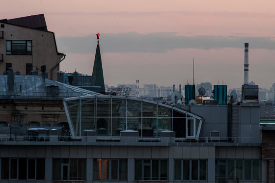 Главное здесь — это небо, самое интересное — наблюдения за драматической сменой атмосферных фронтов или за полной луной в ненастье, за закатами. Рефлексия во время созерцания этого вида сродни переживаниям князя Андрея на поле Аустерлица после ранения, когда слова Наполеона Бонапарта, человека, несомненно, самого могущественного по всем тогдашним рейтингам, ему кажутся жужжанием мухи под величественным небом. Репрезентативная архитектура — это продолжение политики другими средствами. Тот же Кремль или муляж храма Христа Спасителя с вечно бубнящим в телевизоре Гундяевым: когда ты находишься перед ними, они тебя подавляют, они излучают власть. Когда ты на них смотришь отсюда, на торчащие в углу слева кремлевские башни или ХХС, они больше похожи на письменные принадлежности на заваленном хламом столе, а над ними мудрое, высокое и торжественное небо.