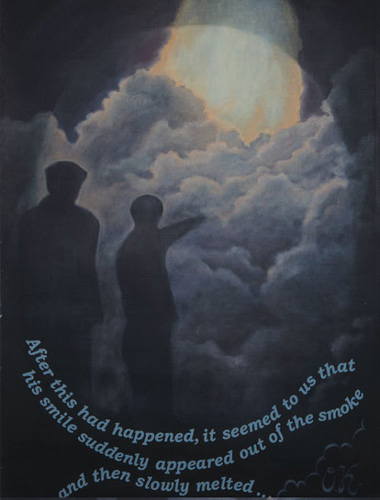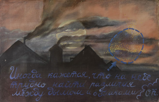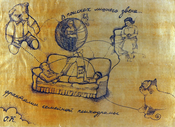 «Облачная комиссия», из серии «Вознесение наблюдателя», 1993-1996 Сверх того, для группы, где на первых ролях выступает Аркадий Насонов, ключевым моментом стала фиксация (ну или конструирование, что в данном случае одно и то же) реальности, но фиксируют ее, то и дело углубляясь в дебри сна. Потому частенько это кажется подернутым плотной галлюцинаторной дымкой. Один из комиссаров ОК Павел Пепперштейн описал Насонова, отталкиваясь как раз от имени: «Само его имя много сообщает о нем и его творчестве — сочетание райского дискурса (Аркадия) с полусказочным онейроидом, напоминающим байки, рассказываемые “на сон грядущий”, слова, сильно размываемые наступающим сном». Младоконцептуалист Насонов прошел выучку на постановочном факультете Школы-студии МХАТ, и хотя бы отчасти этим объясняется его тяга к синтетическому творчеству, где перформансы, инсталляции, графика и тексты сплетаются в единый способ исследовать окружающее. Одновременно эти исследования самоироничны, ведь если художественное творчество принято называть научным словцом, то тут ОК акцентирует диссонанс самим названием.