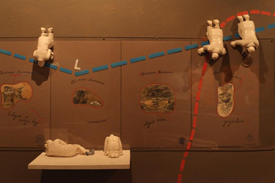 © ГалереЯ Iragui Набор бланков «Облачной комиссии» и скульптуры наблюдателей 1992, 2013 Но — возвращаясь к разговору о старшем поколении, о КД — члены ОК отправлялись и в Подмосковье. «Зона отдыха строгого режима» — как раз такой вояж 1998 года. Обсуждение снов привело художников к глубокомысленному выводу, что в царстве Морфея, когда дело касается отдыха, им грезятся то советские курорты и пионерлагеря, то тюрьмы с казармами. Соответственно, проверить впечатления они поехали на станцию Отдых, где в одноименном поселке нашли участок Зеленая Зона и немедленно узрели закономерность в названиях улиц: «мы обнаружили, что все параллельные улицы зоны названы именами русских писателей-классиков, а перпендикулярные им носят милитаристско-героический характер, стоя на страже параллельных литературно-текстовых рубежей и не давая им возможности пересечься». Поскольку главными достопримечательностями там оказались дачи Вертинского и Шаинского, облачные комиссары решили, что Пьеро тут сосуществует с Чебурашкой, а Зеленая Зона — это «зеленый сигнал», выброс Коллективного Бессознательного в мозги отдыхающих (а разом и заключенных, поскольку дачные участки от посторонних глаз отделяли колючая проволока да собаки). В общем, все эти архивные записи можно счесть потоком сознания, можно и вовсе графоманией, но читать любопытно — примерно как наблюдать за облаками.