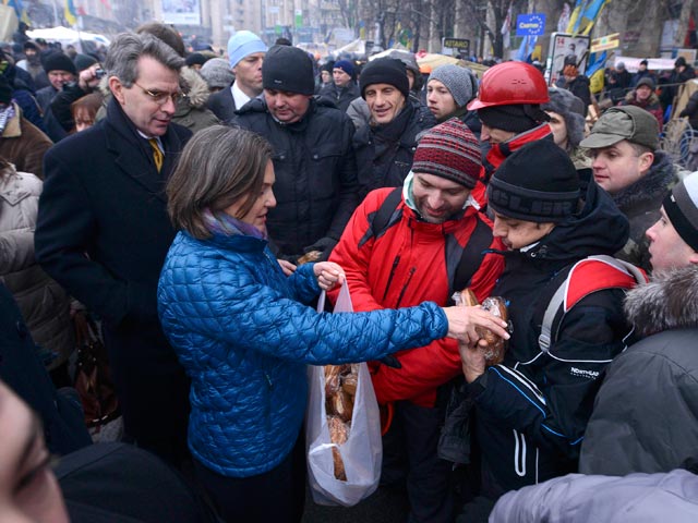 Утром в среду на Майдане в сопровождении американского посла на Украине Джеффри Пайетта появилась заместитель госсекретаря США Виктория Нуланд. Как передает "Интерфакс", Нуланд начала с того, что подкормила участников протеста - из большого пакета она угощала людей печеньем, булочками и хлебом.