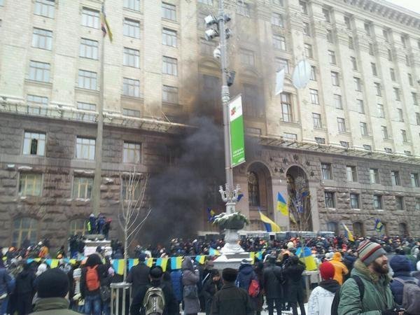 В то же время из окон второго этажа мэрии на автобусы «беркутовцев» бросили несколько петард и дымовую шашку. Также захватившие здание мэрии начали поливать силовиков водой из брандспойтов.