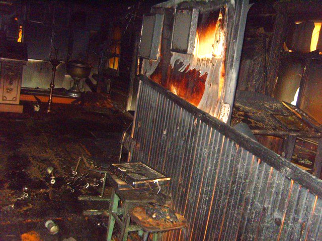 "Поджог был совершен между первым и вторым часом ночи, причем сообщники "разделили обязанности": один облил бензином бревенчатые стены храма, второй поджег самодельный фитиль, затем бутылку с воспламенившейся жидкостью разбили об угол здания. После этого вандалы спешно покинули место преступления.