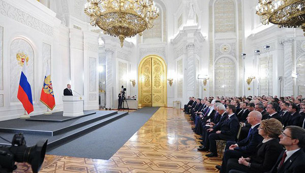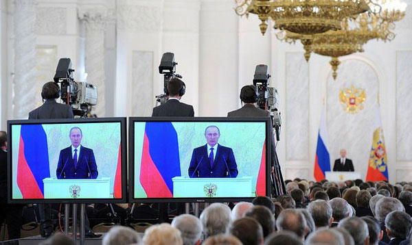 Послание Владимира Путина Федеральному Собранию. Фото: kremlin.ru Международный блок — сплошь «победы России». Сирия (мы там вроде как миротворцы). Иран (тот же вариант), Таможенный союз (куда уже все, то есть Киргизия и Армения, стремятся вступать) и Украина (которую, конечно же, мы никак не хотим никуда насильно присоединять, но - «Еще до всех этих событий, которые сейчас мы видим в Киеве, а я очень рассчитываю, что всем политическим силам страны в интересах украинского народа удастся договориться и решить все накопившиеся проблемы, но еще до всех этих проблем, начиная с мая текущего года Украина изъявила желание и присутствует на всех встречах «тройки» в качестве наблюдателя, участвует в дискуссиях и неоднократно заявляла ранее о своей заинтересованности в присоединении к отдельным соглашениям Таможенного союза. Мы ничего никому не навязываем. Но если у наших друзей есть желание совместно работать, мы готовы к продолжению этой работы на экспертном уровне»).