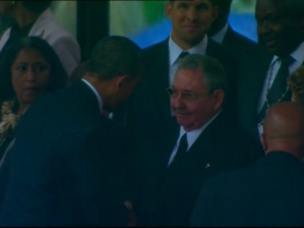 Похороны Нельсона Манделы. Барак Обама пожимает руку Раулю Кастро. Кадр Fox News На церемонию прощания с Нельсоном Манделой, состоявшуюся в Йоханнесбурге 10 декабря 2013 года, прибыл чуть ли не весь мировой политический бомонд. Среди первых лиц (нынешних и прошлых), представлявших практически все сколь-либо значимые государства, были, в частности, несколько американских президентов, включая Обаму, британский премьер Кэмерон и все здравствующие его предшественники плюс принц Чарлз; французы Олланд и Саркози, друг друга с трудом выносящие, шествовали вместе... Даже кубинский руководитель Рауль Кастро не просто прибыл, но и выступил. И только российского президента не было – нашу страну представляла Валентина Матвиенко, мало кем замеченная.
