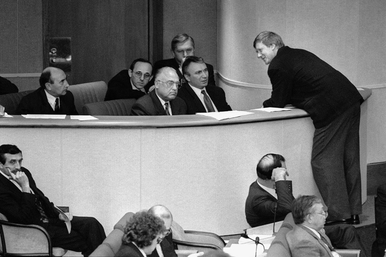 Депутаты первой и второй Государственной думы были еще достаточно дистанцированы от Кремля, поскольку больше зависели от региональных элит, партийных руководителей, коммерческих структур и своих избирателей, чем от Администрации президента. Но характер парламента уже постепенно начинал меняться. Если в 1993 году неожиданно для всех на выборах победила ЛДПР (именно тогда писатель и публицист Юрий Карякин произнес свою знаменитую фразу «Россия, ты одурела!»), то в 1995-м первое место заняли уже коммунисты, и Дума получила откровенно оппозиционную окраску. Политолог Дмитрий Орешкин убежден — именно благодаря тому, что в 90-е годы в парламенте находились люди диаметрально противоположных взглядов и ценностей, им было сложно манипулировать. «Первые две Думы были тем местом, где люди учились заниматься политикой, выстраивать альянсы, работать в рамках закона. Была, например, попытка объявить импичмент Ельцину — для этого надо было с кем-то договориться, взять на себя определенные обязательства. Попытка не удалась, потому что ей противостояли проельцинские силы, но она свидетельствовала о серьезной внутренней борьбе, которой сейчас почти не осталось. Кстати, именно тогда, в 90-е годы, в политику пришли люди, активно функционирующие до сих пор: от Жириновского до Рыжкова».