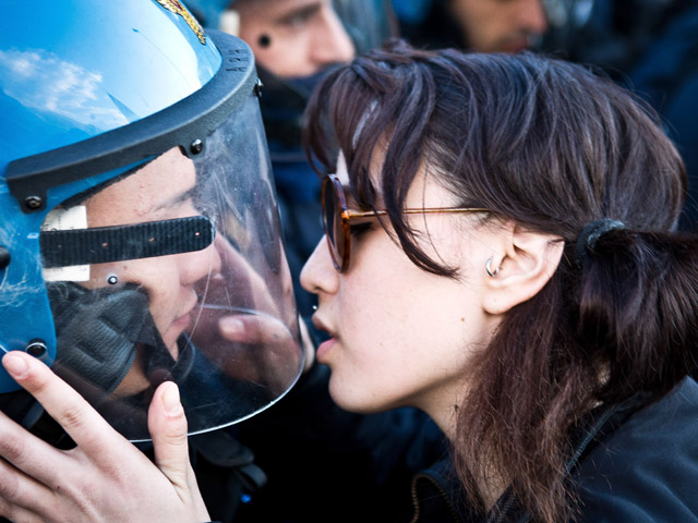 В Италии 20-летнюю манифестантку, поцеловавшую в каску полицейского, отдают под суд за "изнасилование" стража порядка