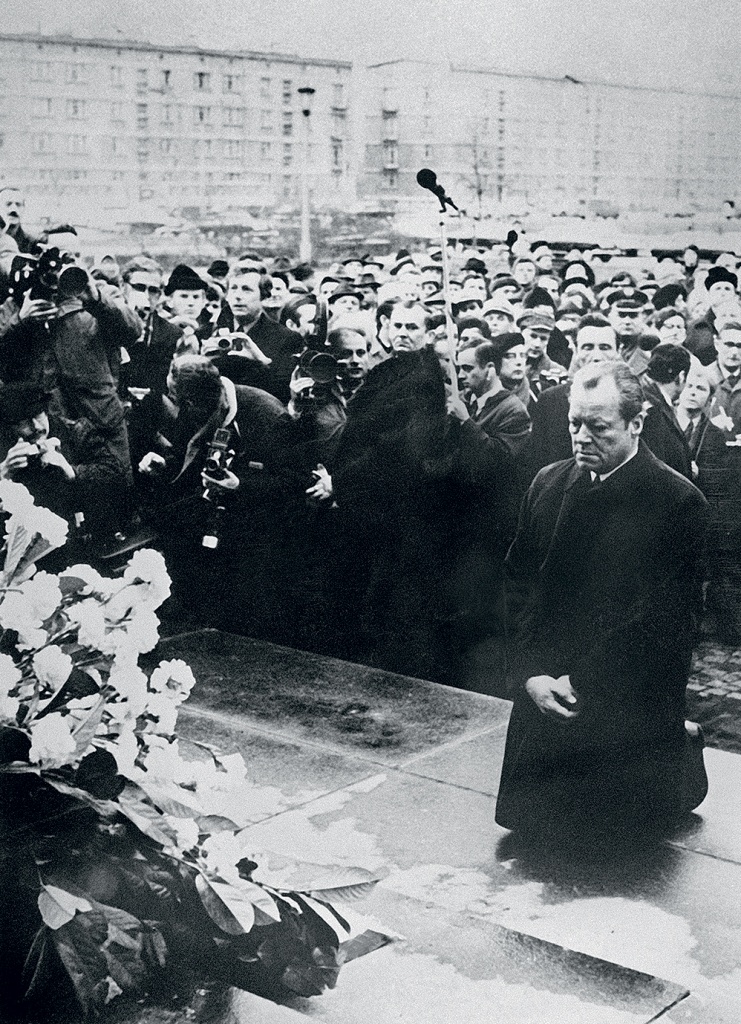 Но поступок, принесший ему Нобелевскую премию мира, он совершил двадцатью годами раньше, в декабре 1970 года, во время посещения Варшавы: канцлер ФРГ Вилли Брандт опустился на колени перед памятником героям и жертвам Варшавского гетто. «Я сделал то, что делают люди, чтобы выразить то, что невозможно высказать словами», — напишет он впоследствии. Точно так же в израильском мемориале Яд Вашем он раскрывает книгу псалмов и читает вслух: «…Мы совершали грехи и преступления. Боже милосердный, прости нас…»