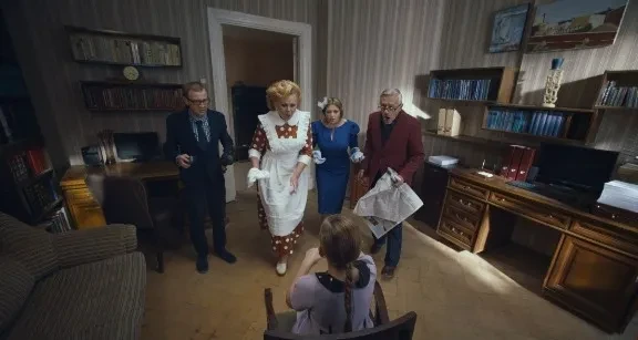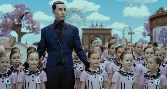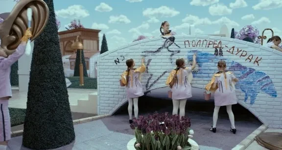 Среди прародителей этой истории и Кэрролл, и «Королевство кривых зеркал», и «Вовка в тридевятом царстве», и «…Швамбрания», и инверсия михалковского «Праздника непослушания». И все же автор сценария Анна Старобинец придумала особенный сладостно-тоталитарный мир, в котором детям запрещено быть детьми. По сути, это воспитательный концлагерь, стачивающий углы индивидуальностей — конвейер по производству откалиброванных, дисциплинированных жизнерадостных функций. Распорядитель, или часовщик заводного государства или часового конвейера, — готический волшебник, он же полпред распрекрасной Королевы, он же — сама распрекрасная Королева (Вячеслав Манучаров) — сам когда-то «выпал» из детства. А лишенные детства мальчики вырастают в настоящих разбойников, по совместительству… в мстительных государственных правителей.