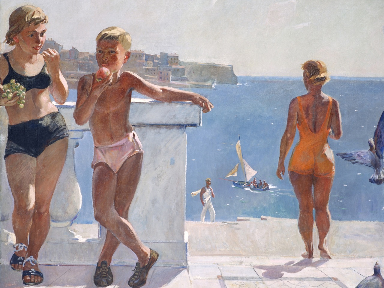 На посвященной спорту советской эпохи лондонской выставке экспонируются 35 работ, принадлежащих московскому Институту русского реалистического искусства, – живопись, графика, скульптура. В Москве выставка будет расширена, в нее войдут произведения из Русского музея и ряда частных собраний. Среди авторов крупные имена советской эпохи: Александр Дейнека, Юрий Пименов, Александр Самохвалов, Георгий Нисский, Сергей Лучишкин, Самуил Адливанкин, Кирилл Кустодиев, Виктор Попков. Спортивные парады, гимнасты, борцы, пловцы, волейболисты – вот сюжеты выставленных работ.