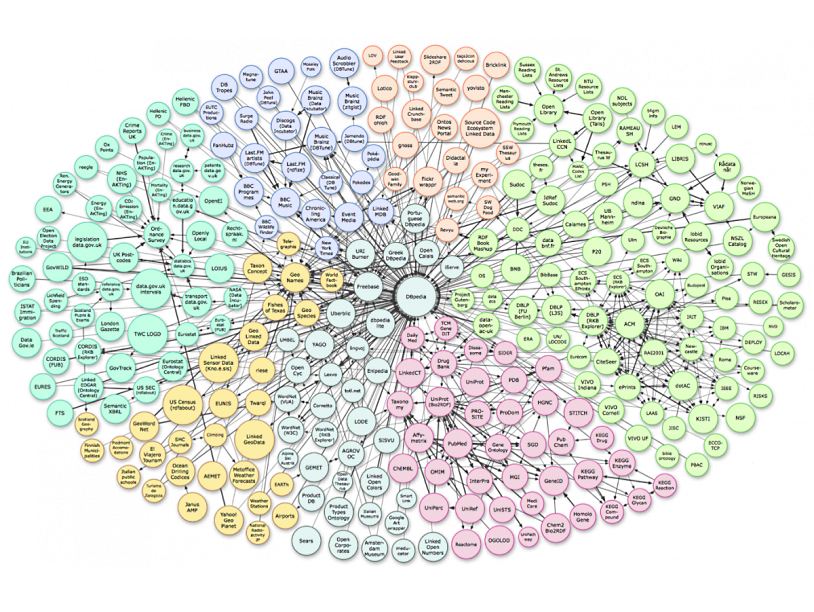 Облако связанных данных, по сути, - это распределенная база данных, состоящая из различных баз, объединенных между собой при помощи унифицированных словарей или онтологий. На эти онтологии есть свои спецификации, которые разрабатывались, в том числе и в консорциуме W3C. Это также касается каталогов государственных данных и онтологий, использующихся для описания людей, как например, онтология FOAF (Friend Of A Friend). Здесь основная идея в том, что требуется организовать онтологии таким образом, чтобы они описывали данные, востребованные в конкретных базах данных. Например, очень востребованы базы данных по экспертам, научным сотрудникам, научным публикациям, учебным курсам и т.д. Это если говорить про онтологии, востребованные в университетах, занимающихся исследованиями в области связанных данных. Таких университетов довольно много на Западе. Они выкладывают свои данные в виде связанных открытых данных и делают их “перевязку” в облаке связанных открытых данных.