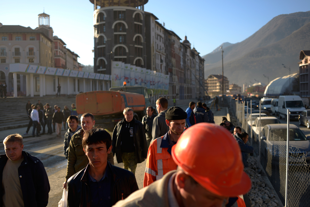 От мигрантов в Сочи начали избавляться еще в июне, притом что на сочинской стройке работали в основном приезжие из Таджикистана, Узбекистана, Молдовы и Украины. По данным ГК «Олимпстрой», в 2013 году здесь работало 76 тыс. человек, причем иностранцев было только 16 тыс. Однако Семен Симонов, координатор правозащитного центра «Мемориал» в Сочи, с этими цифрами не согласен: «Большая часть мигрантов была не оформлена. Если взять статистику сочинского УФМС, то получится, что на стройках, связанных с Олимпиадой, работало до 50 тыс. иностранцев». Жили либо в вагончиках (причем если вагончик был рассчитан на двоих, селили туда человек восемь — просто ставили многоярусные кровати), либо прямо на недостроенных объектах. «В селе Веселое, где «Олимпстрой» возводил жилье для волонтеров, рабочие жили в недостроенных зданиях по 20–30 человек в комнате, — рассказывает Симонов. — Ни удобств, ни коммуникаций. Еду им готовили местные из деревни». 12 июня на объекте прошла первая облава полиции: из 160 задержанных работников половина была депортирована. Интересно, что мигрантам так и не успели заплатить, впрочем, и до депортаций многие рабочие получали зарплату первые пару месяцев, потом какое-то время работали бесплатно, довольствуясь обещаниями бригадиров, а потом увольнялись, так и не дождавшись денег.