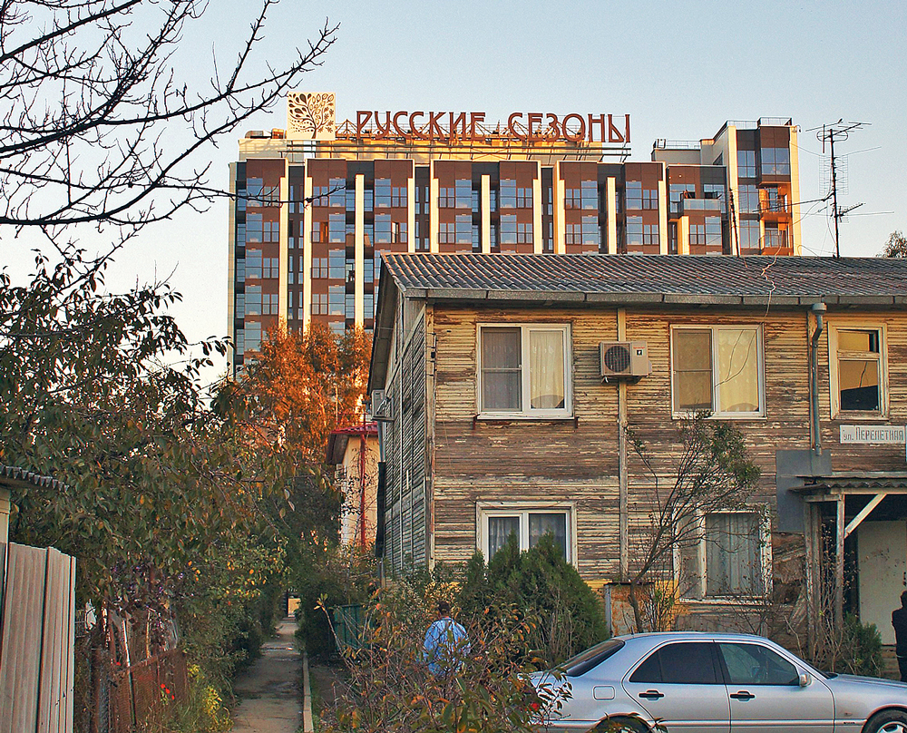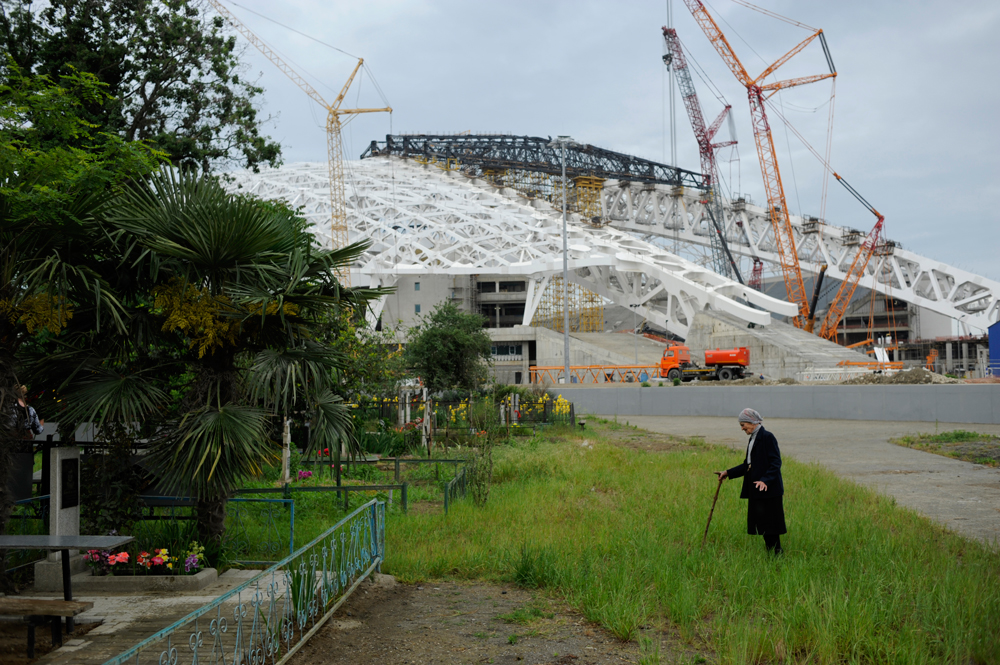 «Русские сезоны», — написано на современном многоэтажном отеле из стекла и бетона в Имеретинской низменности. Здесь наводят последние штрихи, чтобы сдать стадионы и гостиницы и завесить баннерами всё, что не успеют облагородить. Прямо под «Русскими сезонами» поселок Таврический, вернее, то, что от него осталось. Большая часть поселка застроена выросшими как грибы после дождя мини-отелями, частными виллами или 4–5-этажными многоквартирными домами (70 тыс. рублей за метр). По соседству — деревянные бараки, двор между которыми напоминает декорации к фильму ужасов: ржавые покосившиеся качели скрипят на ветру, пожухлые деревца обступили остов старой «Волги», все это покрыто толстым слоем строительной пыли. Рядом с подъездом стоит Галина — молодая симпатичная женщина с коляской. «Как живем? — отвечает она на вопрос корреспондента The New Times. — Резиновые сапоги надеваем, чтобы из этого ужаса выходить. Скорая помощь и такси к нам не приезжают, до школы идти через стройку». Галина зарабатывает тем, что готовит еду для рабочих: «Салаты, котлеты, супы варю». Она с готовностью показывает свою квартиру: в темных сырых комнатах повсюду от стен отстают обои, центральное отопление не работает, а электричество отключают по нескольку раз на дню, так что от обогревателей тоже мало толку: «Обещали нас переселить, — говорит Галина, — но пока вот только забором обнесли».