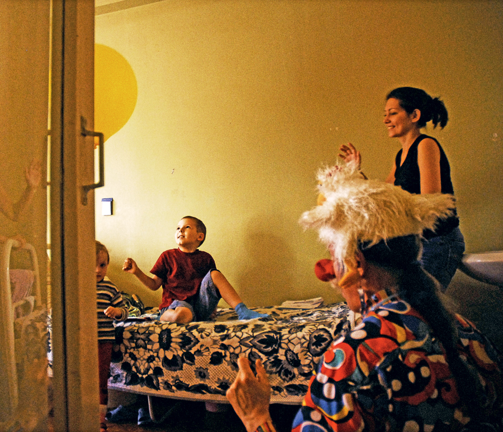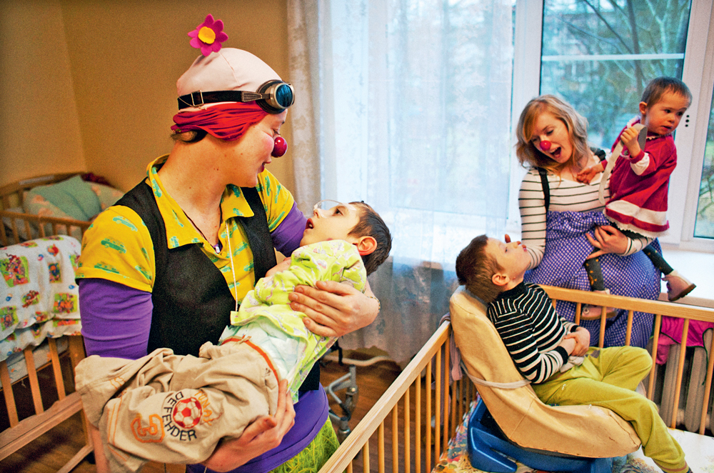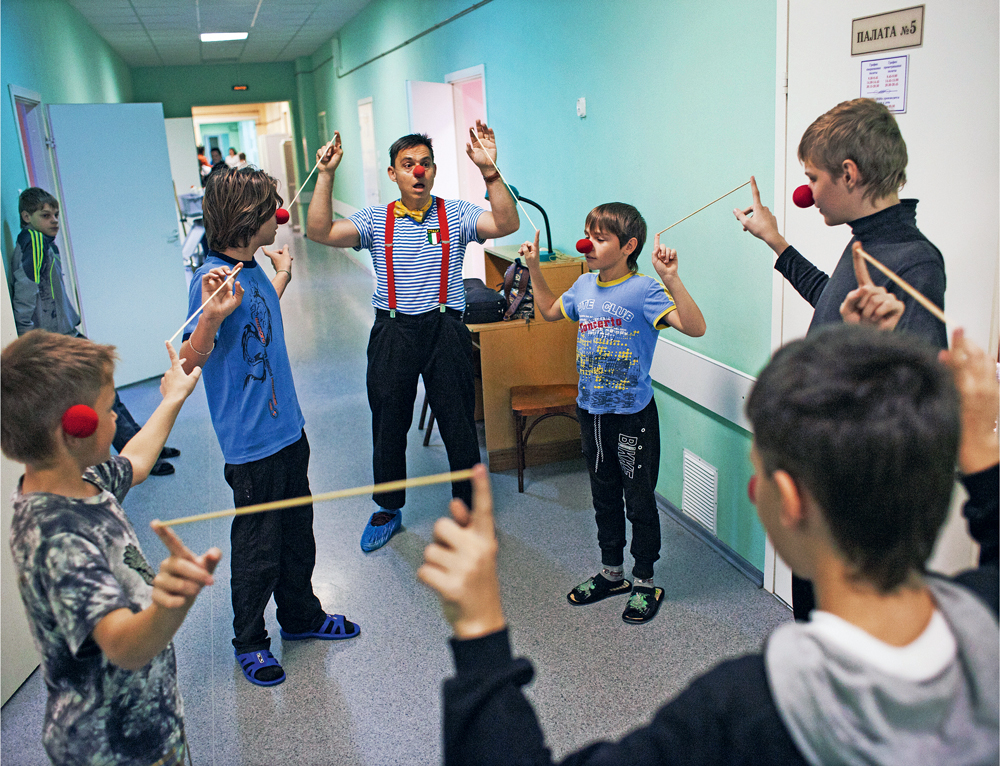 Пациенты в Российской детской клинической больнице Москвы радуются — приехали клоуны. Ноябрь 2013 г.