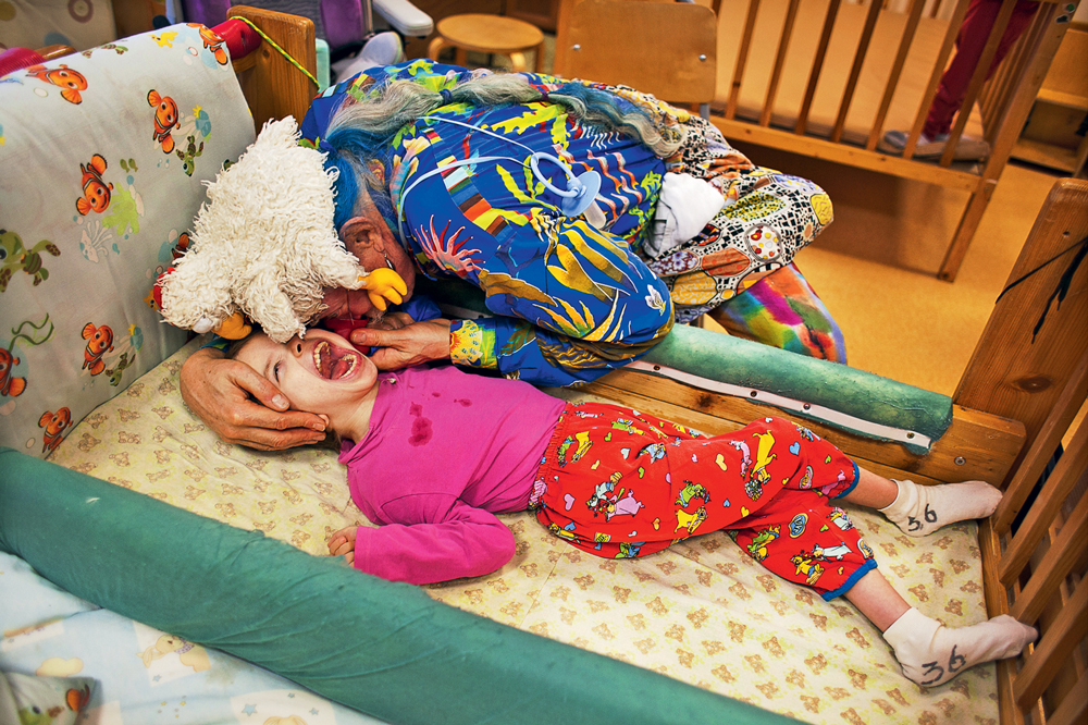 Итальянка Джиневра Сангвино (слева) приезжает в Россию каждый год, но не знает русского языка. «Часто улыбка становится началом диалога. Волонтеры часто не знают русского языка, и улыбка становится их первым инструментом, первым шагом к общению», — говорит она. Сангвино в интернате для слепоглухих детей в Сергиевом Посаде. Ноябрь 2013 г.