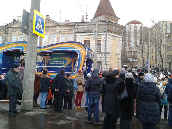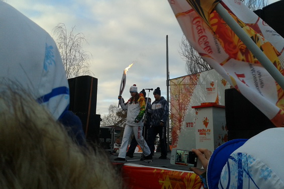 Уже за час до официального начала мероприятия к месту событий нестройными колоннами подходят школьники. Похоже, никто в Самаре не учится 25 декабря, потому что все сорок километров эстафеты нужно заставить ликующим народом, а студенты и школьники ликовать умеют, в том числе и по команде. Отдельные группы учащихся наряжены в униформу олимпиады: сине-зеленые пестрые куртки, шапки-ушанки, белые шарфы с символикой. Флаги большие и флажки поменьше. С олимпиадой и кока-колой, с колой преобладают, так как еще и ограждение украсили такими флажками. Флаги дрожат от ветра. Ноги вязнут в мокром снегу.