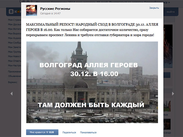 В социальной сети "Вконтакте" через два часа после взрыва на вокзале в Волгограде, унесшего, по последним данным, как минимум 18 жизней, появился призыв собраться в понедельник, 30 декабря, в 16:00 на Аллее героев на "народный сход" и требовать отставки губернатора и мэра.