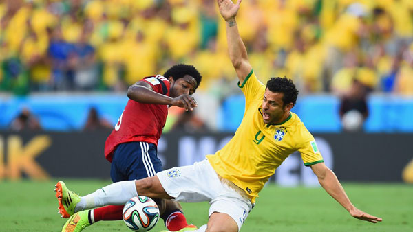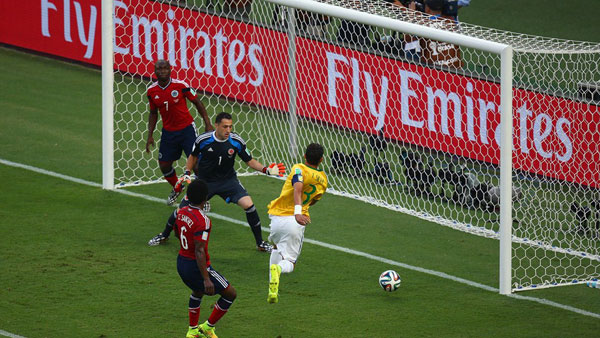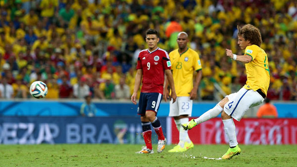 ГОЛ: Давид Луис ударом со штрафного метров с 35 забивает второй гол в ворота колумбийцев - 2:0 в пользу сборной Бразилии На 68-й минуте.
