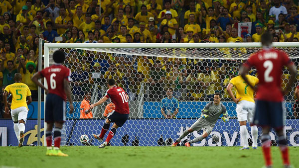 ГОЛ! Хамес Родригес отыгрывает один гол с пенальти - 2:1 в пользу бразильцев за десять минут до конца основного времени.