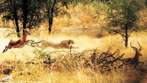 Гепард Acinonyxjubatus — самое быстроногое животное на Земле. Он подкарауливает неосторожную жертву в густой траве или в кустарнике, а затем настигает могучим спринтерским рывком. При максимальной скорости более 100 км/ч он догнал бы любую добычу, если бы она мчалась по прямой. Но потенциальная жертва маневрирует, скачет то вправо, то влево, и довольно часто ей удается удрать от лучшего спринтера планеты.