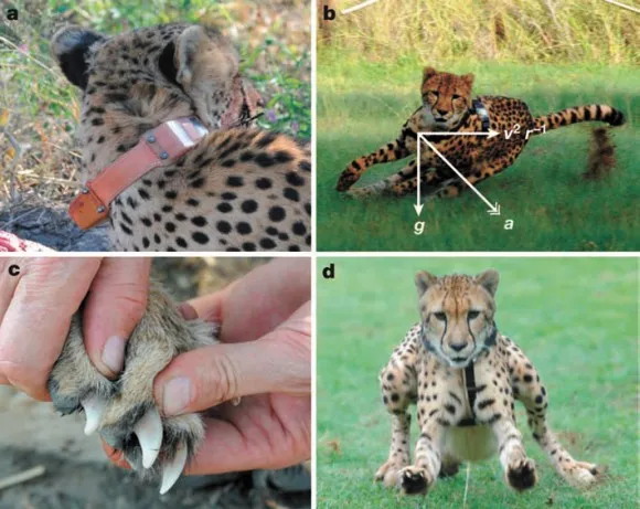 Гордостью лаборатории Уилсона являются ошейники, оборудованные модулем GPS и очень чувствительными электронными датчиками движения. В результате исследователи могли определять скорость, ускорение и наклон тела гепарда во время движения, а также его координаты с точностью до 20 см. Ошейник снабжен аккумулятором, который подзаряжается от солнечной батареи, страховочной батарейкой и программным обеспечением, позволяющим снимать показания приборов и перепрограммировать их удаленно, чтобы не беспокоить животных. Сам ошейник гепардов тоже не обременяет, поскольку весит всего 340 г. (Подробнее об ошейниках для слежения за разными животными можно прочесть на сайте лаборатории [2].)
