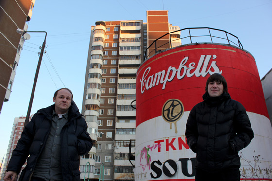 © Егор Путилов Евгений Фатеев Тогда, в апреле 2011-го, ФСБ нашла «Злых» и провела воспитательную работу. Глава и мозг группы вскоре после этого оказался в армии, а единственному продолжающему работать члену «Злых» Саше политика стала «не так интересна». «Да-да, — встревает в разговор Фатеев, — политика — это же скучно. Кому это нужно? Стрит-арт — это любовь, это позитивные эмоции». На волне позитивных эмоций баки во дворах многоэтажек одной из спальных окраин города покрасили под сгущенку и под консервированный томатный суп. «Это как у Уорхола! Администрация района пошла нам навстречу. У нас вообще с ними хорошее сотрудничество. Нам сейчас и мэрия, и представительство президента стали помогать», — комментирует Фатеев.