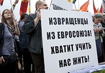 Как утверждают чиновники МИДа, ЕС пытается "добиться от других стран принятия чуждого для них взгляда на гомосексуализм и однополые браки как норму жизни и некое естественное социальное явление, заслуживающее поддержки на государственном уровне". Такая политика, говорится в докладе, встречает сопротивление не только в странах, "придерживающихся традиционных ценностей", но и в тех государствах, где принято терпимое отношение к представителям ЛГБТ-сообщества. Так, отмечают авторы, во Франции проходили многотысячные митинги против легализации гомосексуальных браков и усыновления детей однополыми парами.