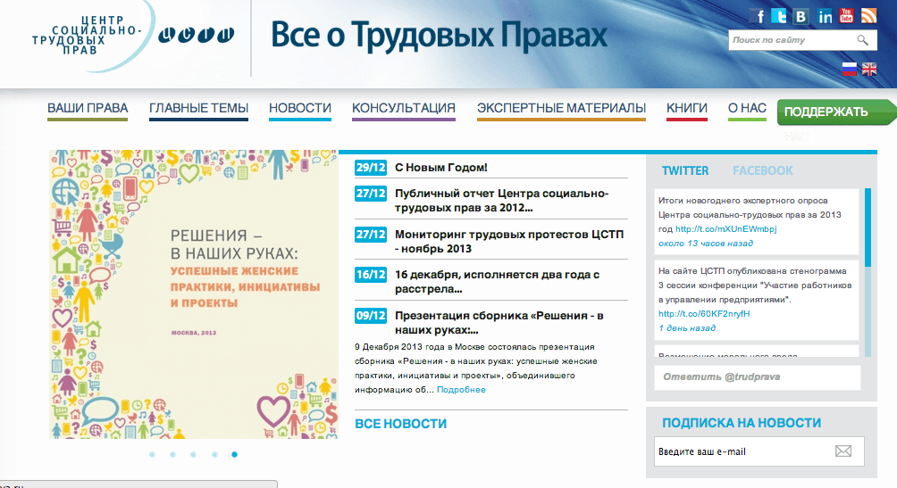 Дата16.01.2014АвторДарья АлексееваИсточникТеплицаСохранённая копияInternet ArchiveOriginal MaterialShow translationОнлайн-приемная о трудовых правах «Все о трудовых правах» – это проект Центра социально-трудовых прав, навигатор по трудовому законодательству, онлайн-приемная и каталог экспертных материалов, исследований и аналитических докладов.