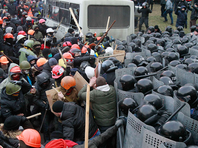 От "народного вече" в Киеве отделилась часть активистов, направившаяся к милицейским кордонам, огораживающим правительственный квартал. На улице Грушевского у стадиона "Динамо" демонстрантам удалось вытянуть из кордона один из автобусов. Затем произошла "провокация": молодые люди в касках стали молотить палками по милицейскому автобусу. Несколько ударов достались и бойцам "Беркута", стоявшим в первом ряду кордона.