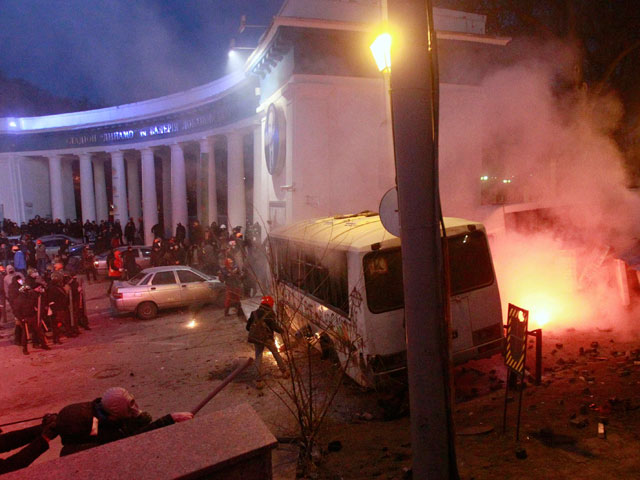 Столкновения начались днем (ХРОНИКА). От "народного вече" в Киеве отделилась часть активистов, направившаяся к милицейским кордонам, огораживающим правительственный квартал. На улице Грушевского у стадиона "Динамо" демонстрантам удалось вытянуть из кордона один из автобусов. Затем произошла "провокация": молодые люди в масках подожгли "коктейлями Молотова" два милицейских автобуса и напали на бойцов "Беркута". Cобравшихся разгоняли свето-шумовыми гранатами и слезоточивым газом.