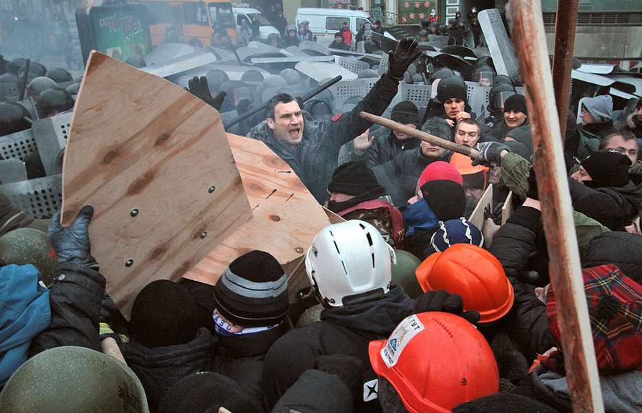 Несогласных оказалось несколько тысяч. В прямом эфире наблюдаю, как объединение националистических сил «Правый сектор» ведет их с майдана в сторону находящейся неподалеку улицы Грушевского, где находится здание парламента. Между протестующими и кордоном силовиков моментально начинаются столкновения. Агрессивно настроенная молодежь поджигает один из автобусов спецподразделения «Беркут» и забрасывает силовиков камнями и петардами. Те отвечают светошумовыми и газовыми гранатами, отстреливаются резиновыми пулями. Водометы периодически поливают митингующих, но работают не на полную мощность — это скорее сильный ливень, чем сбивающая с ног струя. Активисты, облитые водой на пятиградусном морозе, вспоминают о выпавшем на это же воскресенье празднике Крещения и скандируют: «Водохреща, водохреща!»