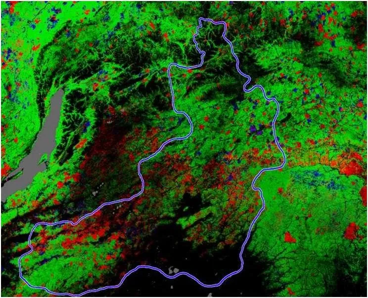 Фото: olegkorsun. Синяя линия - границы Забайкальского края, черное - степи, зеленое - лес, красным показаны участки, испытавшие обезлесивание за последние 10 лет. В нижнем правом углу - Китай.